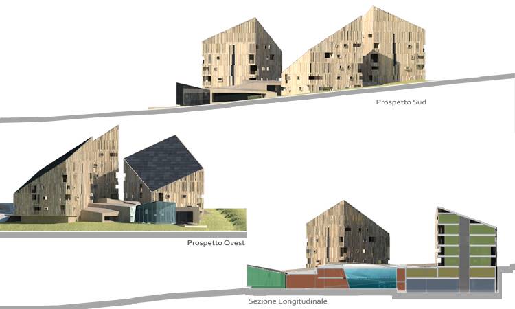 L'area di progetto presenta un terreno digradante; abbiamo scelto di assecondare la pendenza del terreno con un corpo di fabbrica che accompagnasse la collina e raggruppasse le funzioni collettive, e di disegnare i blocchi delle abitazioni che si innalzino come vette delle Dolomiti verso il cielo limpido di queste montagne, senza però diventare elementi impattanti, ma al contrario, integrarle con il paesaggio circostante attraverso l'uso di un materiale molto diffuso e tradizionale per Cortina d'Ampezzo, il legno, che riveste questi edifici, conferendo loro l'aspetto di un rivestimento irregolare come quello di un tronco d'albero. Questo particolare rivestimento formato da pareti ventilate alternate ad elementi brise-soleil scorrevoli che saranno realizzate mediante da telai metallici su cui sono montati elementi verticali in legno con una tessitura dissimmetrica presenta dove necessario, cioè dove sono presenti finestrature, la possibilità di essere "impacchettate" e così aprire l'abitazione al solenne e placido paesaggio circostante.